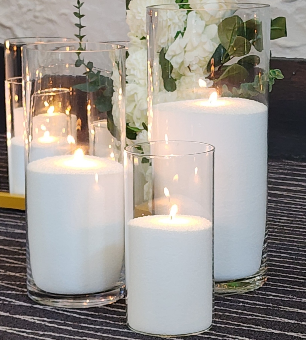 Did you know our snow white wax pearls float? These versatile pearls can transform your decor by creating stunning, customized candles. We fill a vessel with greenery, vibrant florals, or other decorative elements, add water, then top it with our snow white wax pearls. The result is a unique, eye-catching candle that perfectly matches your event florals and adds a touch of elegance and charm to any setting.